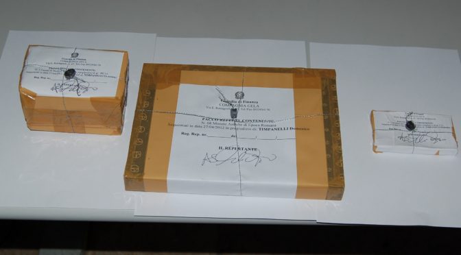 “Controlli fatti dalla Procura, hanno accertato che i soldi che io avevo investito dagli Acciaro erano soldi puliti, frutto di tanto mio lavoro e sacrifici” dichiara Timpanelli. “Non so però se la Procura di Gela abbia mai verificato come Acciaro abbia speso i miei soldi, assieme a chi, o se abbia regalato una parte di denaro a qualcuno. Una cosa però é certa che quelli erano i miei risparmi, che mi sono stati sottratti con l’inganno di un investimento che fu invece una truffa”. Il 27 Aprile 2012, Domenico Timpanelli, venne arrestato in una operazione ambigua, gestita dal capitano Paolo Salemi di Avola, allora comandante del nucleo operativo della Guardia di Finanza di Gela. Dopo una perquisizione già conclusa, dalla ruota anteriore sinistra della vettura del Timpanelli, sarebbe uscito fuori un solo pacco contenente mezzo kilo di hascisc e 5 grammi di cocaina. Timpanelli ed il suo avvocato Rocco Fasciana, che nel frattempo si erano allontanati e che davano le spalle ai finanzieri, non videro nulla, semmai sentirono gridare “Bingo”! I tre pacchi esposti sul tavolo della caserma con i sigilli della Guardia di Finanza, (foto principale di questo articolo), sono la prova del fallimento di tutta l’operazione. “Quanto rappresentato sulla foto di copertina, non é il corpo del reato che sarebbe stato estratto da dietro la ruota” sostiene Timpanelli. “Quello che sarebbe stato ritrovato, era un solo grosso pacco, imballato con la stessa tipologia di nastro e stesso colore che avvolge i tre pacchetti in foto e che furono “rifatti” in caserma dai finanzieri, dopo il mio ingiusto arresto”. Dopo quella perquisizione molto ambigua, l’involucro che avvolgeva il corpo di reato originale sparì ed assieme al predetto, sparirono anche le impronte digitali benché il Timpanelli e sua madre, chiedevano disperatamente di farle verificare. Né mai Timpanelli o il suo avvocato vennero chiamati, durante il ritrovamento e l’estrazione del pacco di droga da dietro la ruota. Tutto avvenne in pochi secondi, dietro le spalle di Timpanelli e del suo avvocato, a pochi metri di distanza.